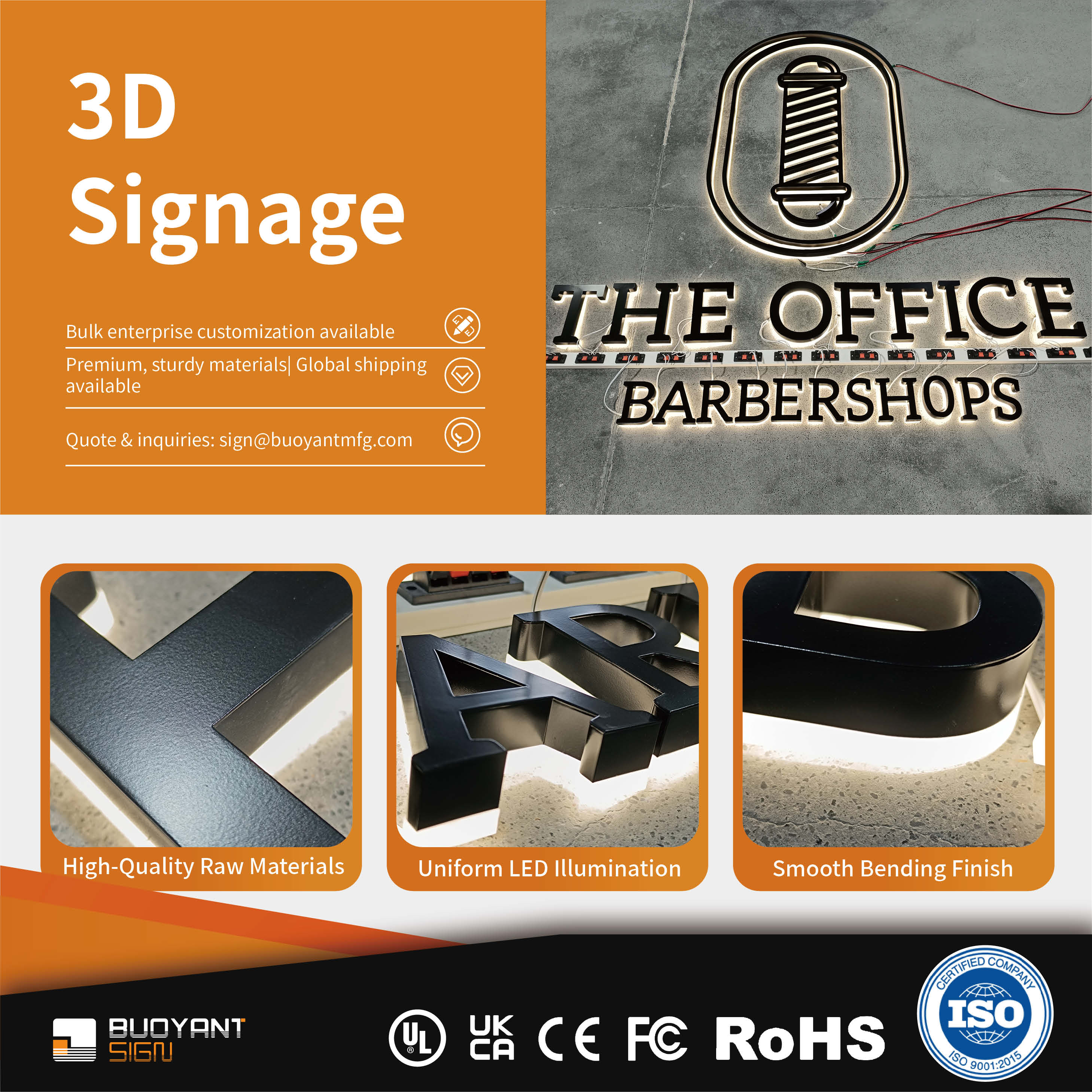 Our 3D Signage are meticulously crafted from premium materials such as acrylic, stainless steel, PVC sheets, and metallic paints. We possess a mature large-scale production system and an efficient delivery mechanism. Offering comprehensive personalized customization, we allow flexible adjustments for font styles, size specifications, and color combinations, fully meeting the bulk purchasing needs of diverse clients. These letters achieve a perfect balance of visual impact, durability, and installation convenience across various scenarios, including: