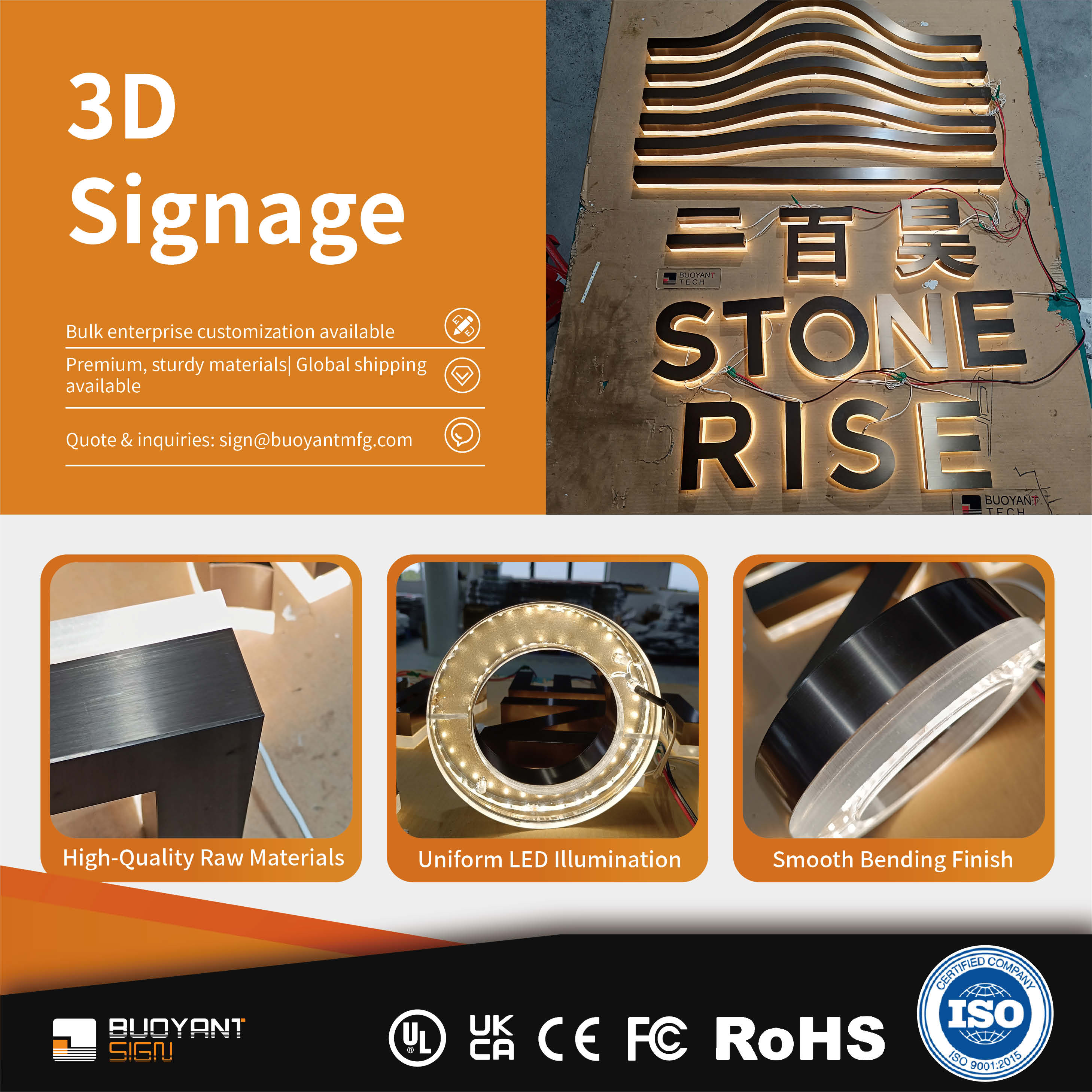Our 3D Signage are meticulously crafted from premium materials such as acrylic, stainless steel, PVC sheets, and metallic paints. We possess a mature large-scale production system and an efficient delivery mechanism. Offering comprehensive personalized customization, we allow flexible adjustments for font styles, size specifications, and color combinations, fully meeting the bulk purchasing needs of diverse clients. These letters achieve a perfect balance of visual impact, durability, and installation convenience across various scenarios, including: