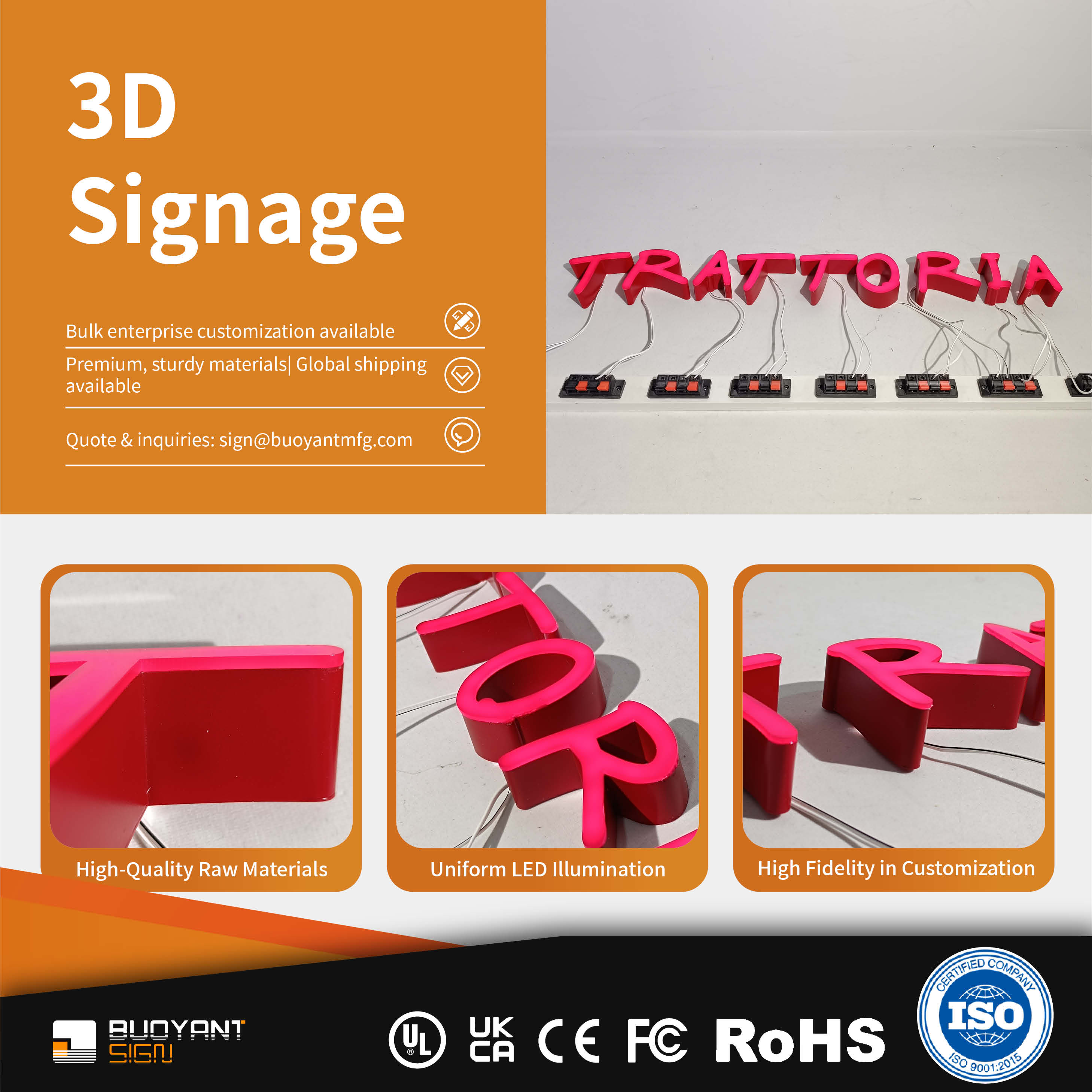 Our 3D Signage are meticulously crafted from premium materials such as acrylic, stainless steel, PVC sheets, and metallic paints. We possess a mature large-scale production system and an efficient delivery mechanism. Offering comprehensive personalized customization, we allow flexible adjustments for font styles, size specifications, and color combinations, fully meeting the bulk purchasing needs of diverse clients. These letters achieve a perfect balance of visual impact, durability, and installation convenience across various scenarios, including: