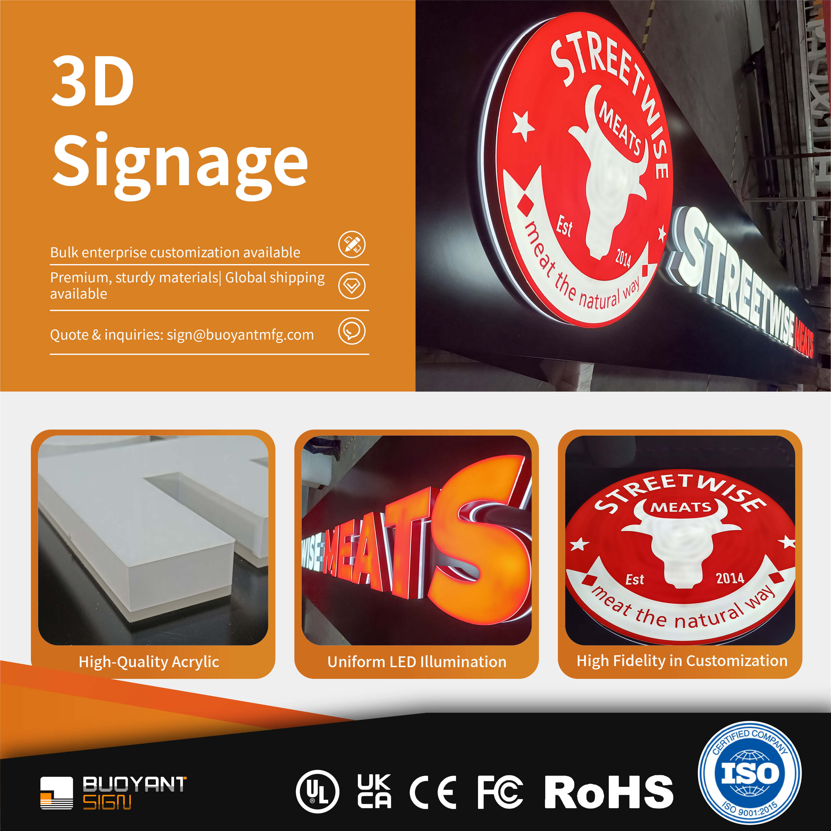 Buoyant Sign: Custom LED Acrylic Front & Backlit Signs with Backboard for Business. Meets brand-building needs, precise, durable, fits scenes. Source maker: global customization/shipping. Inquiry: sign@buoyantmfg.com