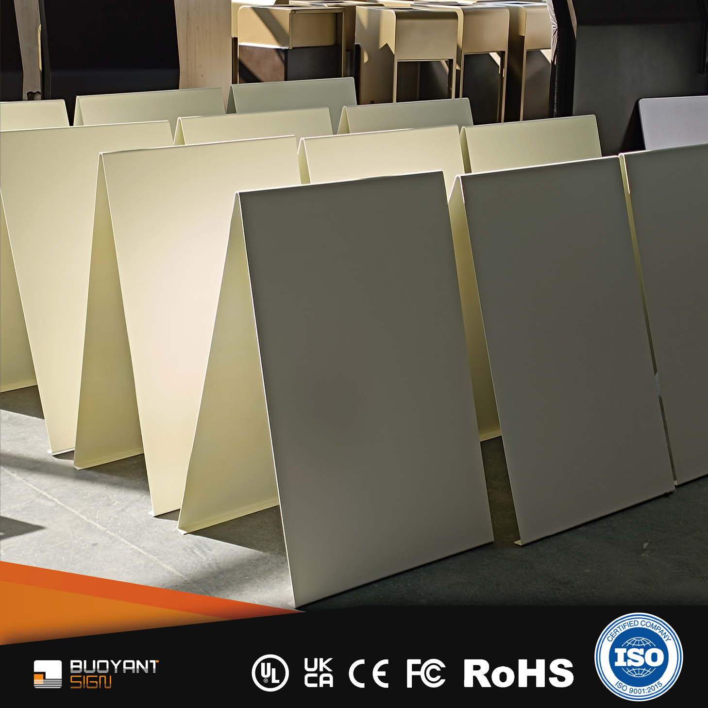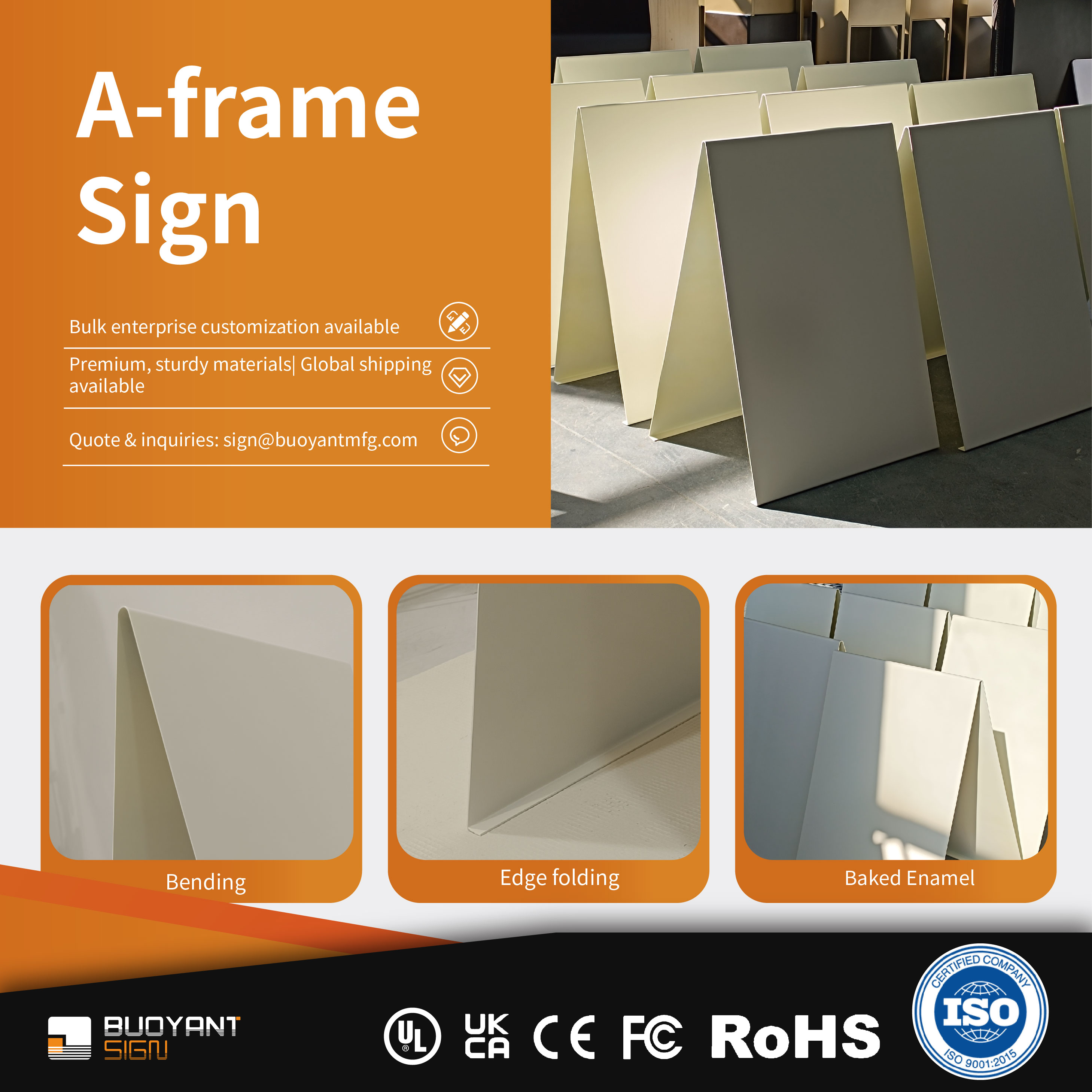 BUOYANT SIGN: Bulk Custom One-Piece Bending A-Boards for Enterprises. Crafted via one-piece bending, stable quality. Accepts large orders, unifies brand image. Customizable per brand needs, global shipping. Inquiry: sign@buoyantmfg.com