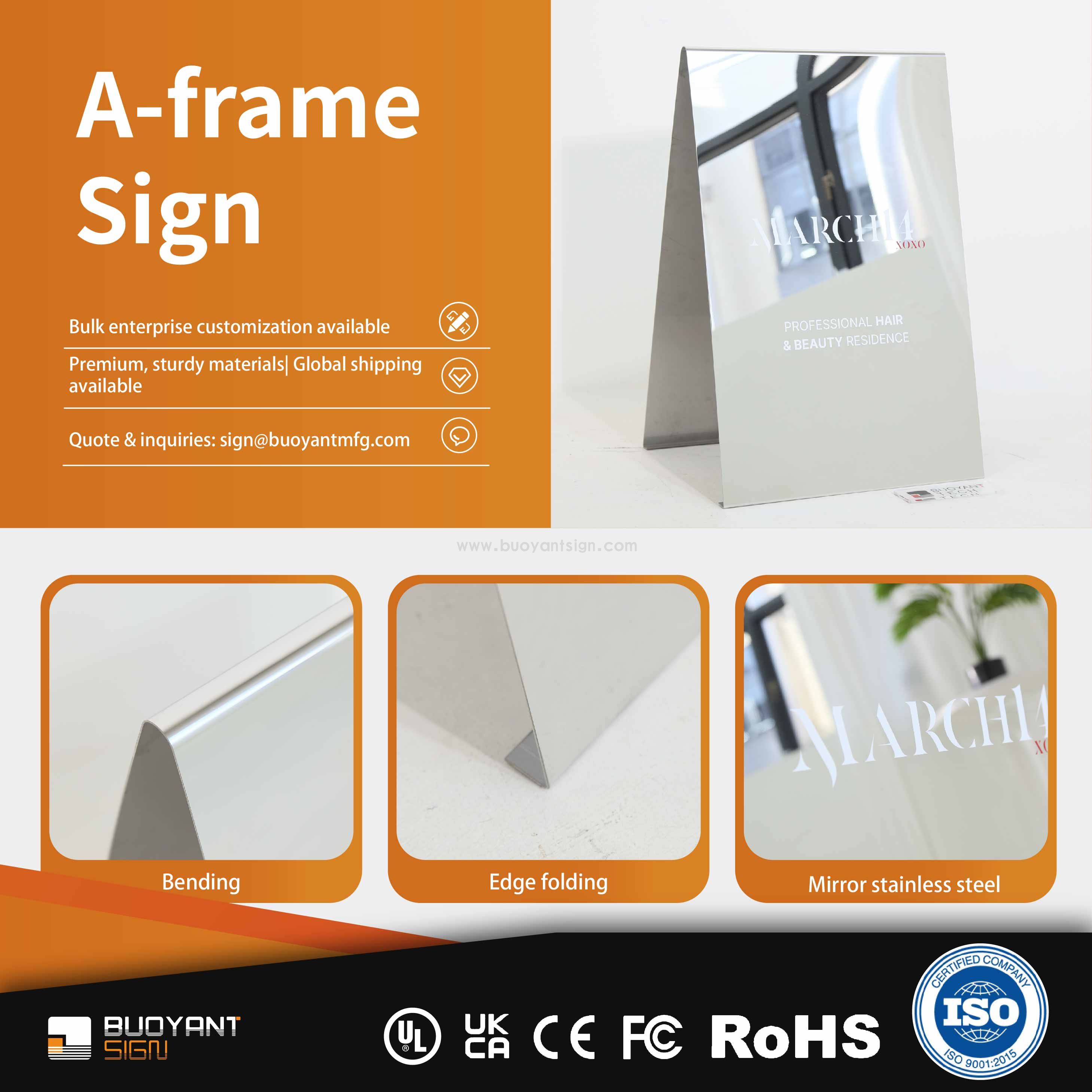 Specialized in manufacturing mirror stainless steel one-piece bent A-frame signs(AAFSSS-mfssopb70)